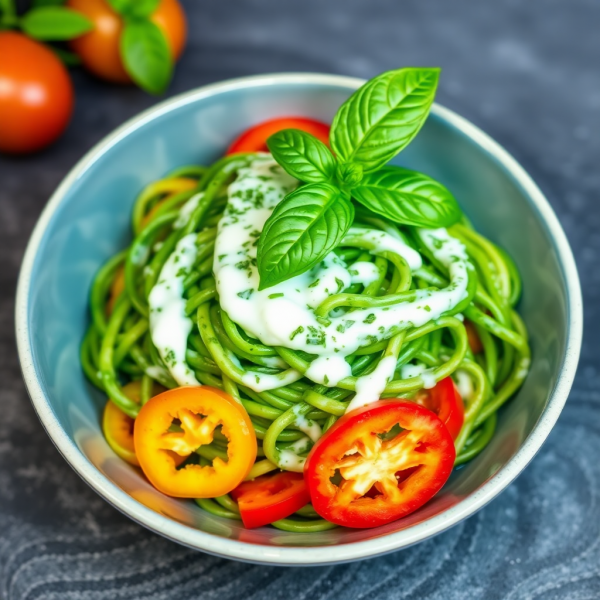 3. In a large mixing bowl, combine the cooked noodles, sliced bell peppers, and the yogurt-pesto mixture. Toss gently to coat all ingredients evenly.